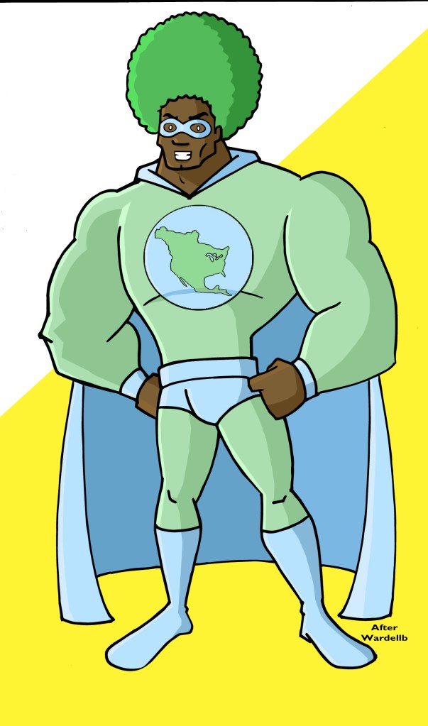 I explained the visual I had in mind to Celina Hernandez and she came up with the above image. Looks great. I asked her to give the image a bit of an “animated” feel, as I kind of thing this character would work best as a cartoon, or maybe a series of animated shorts meant to teach views about climate change, and the preservation of the environment. I view him a sort of a Johnny Bravo-ish over-the-top character, who stops people from littering and such, always with some high-minded lecture about taking care of the planet.