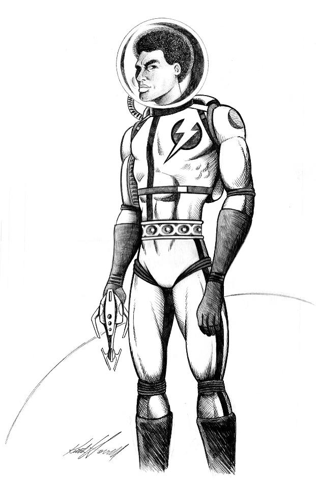 This character was created as a companion to STARSHIP CAPTAIN STORMALONG. Stormalong is a space pirate, with his own ship, and therefor he needs a crew. So I figured I’d update another American folk hero to be Stormalong’s First Mate, and I decided to go with John Henry. So, much like with the first image, I went to Keith Howell and told him to draw a “sci-fi version” of John Henry. The only requirement I gave him was to give John Henry and afro. I just think it’s kind of funny to have this futuristic character with this retro hair style.