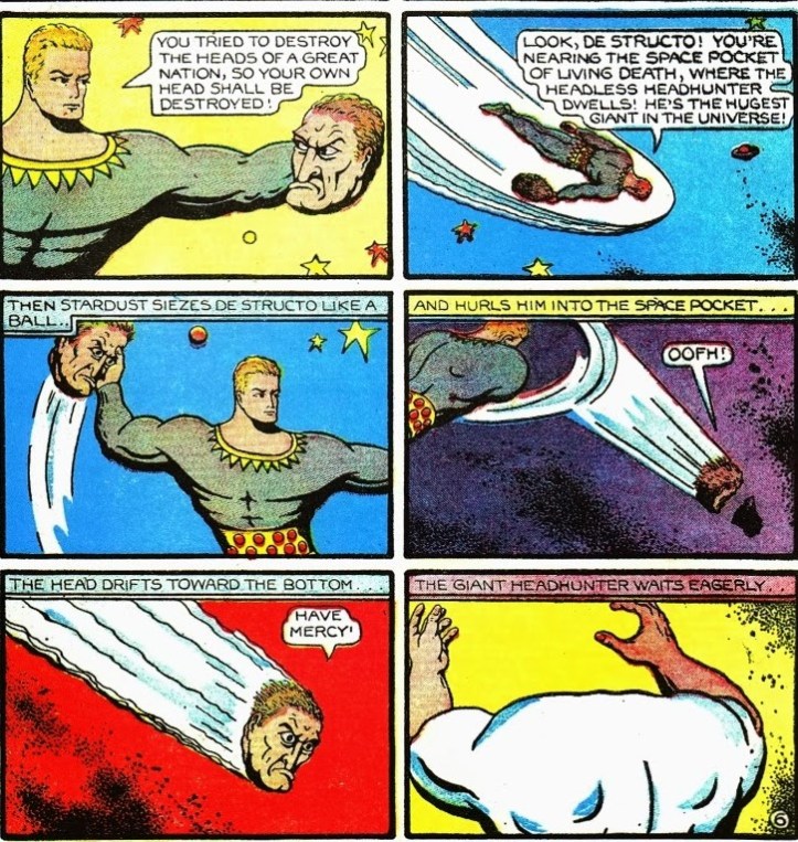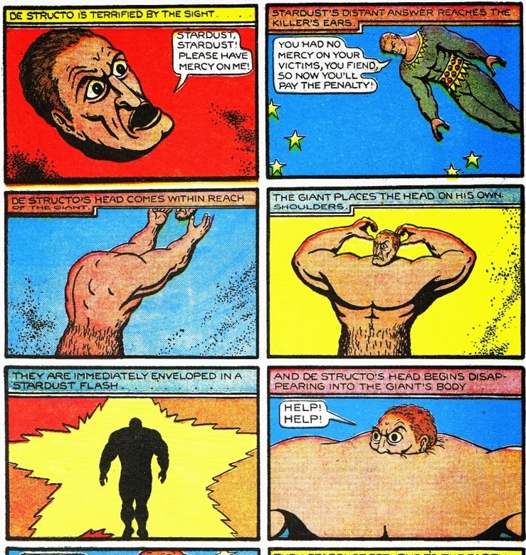 But the weirdest punishment had to be what happened to “Destructo,” the leader of an “international racketeering mob.” After defeating Destructo’s mob, Stardust transforms Destructo into nothing but a head. And then. . .
