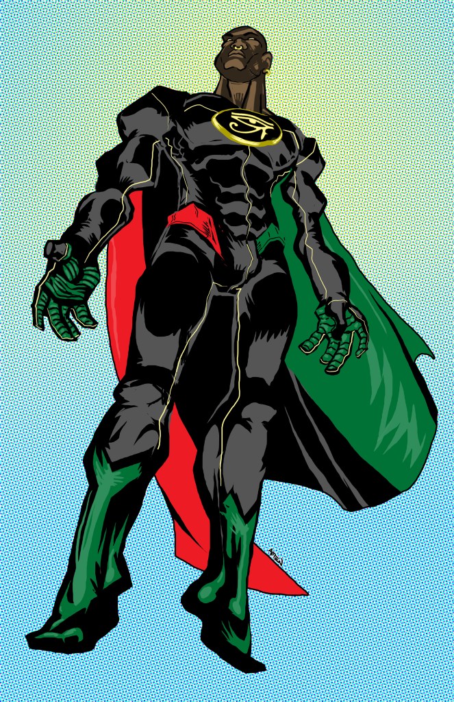I’ll admit that I haven’t developed this character that much yet. It was mainly just a name that popped into my head, followed by an image. HERU is another name for the Ancient Egyptian God, HORUS, who has long been a favorite of mine. I’m not sure what the official difference between the two names is, but I’ve noticed that HERU is the name more commonly used among Black folks, and in artwork Heru is more commonly portrayed as a Black man, as he should be.