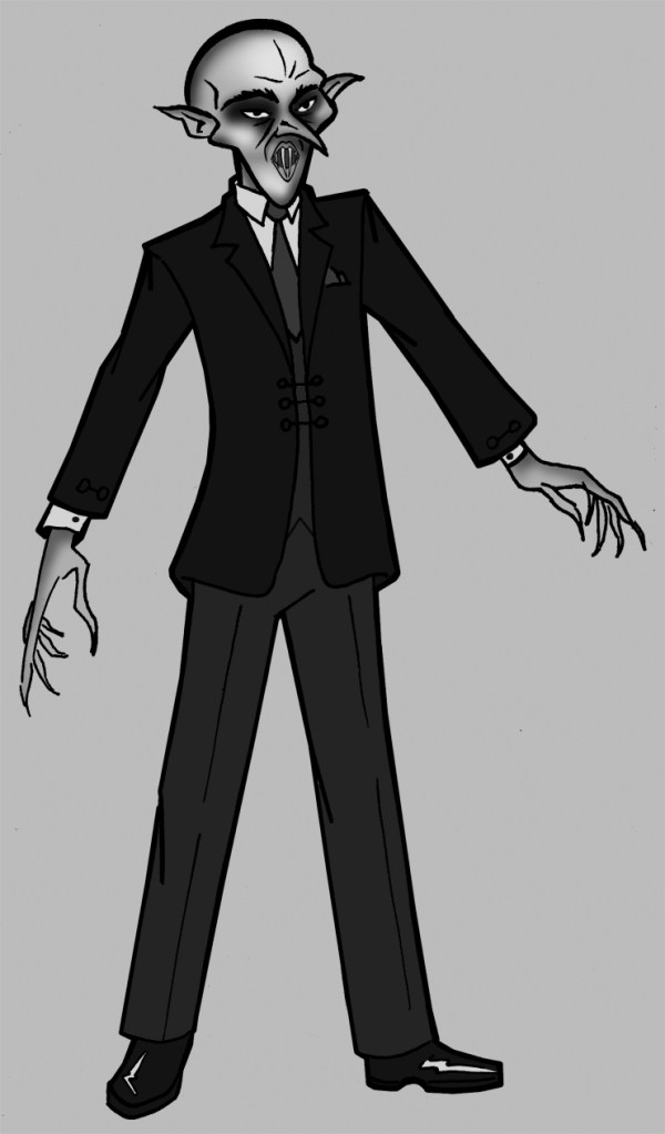 Eventually I came up with the idea of using Dracula as a primary villain in many of my superhero stories. I figure a powerful vampire is a perfect villain for super-powered characters, as he’s got magical abilities to combat them. And so I decided to use “President Dracula” as the ruler of the nation of Transylvania, ala Doctor Doom and Latveria. He’s got an army of vampires, werewolves, and other supernatural beings that he uses to spread terror throughout the world. But then as Dracula has been more frequently used in various types of fiction, including comic-books, I thought it better to use the Orlock character in that role instead. So I commissioned CELINA HERNANDEZ to draw me an image Orlock in a business suit, and she provided me with the above image.
