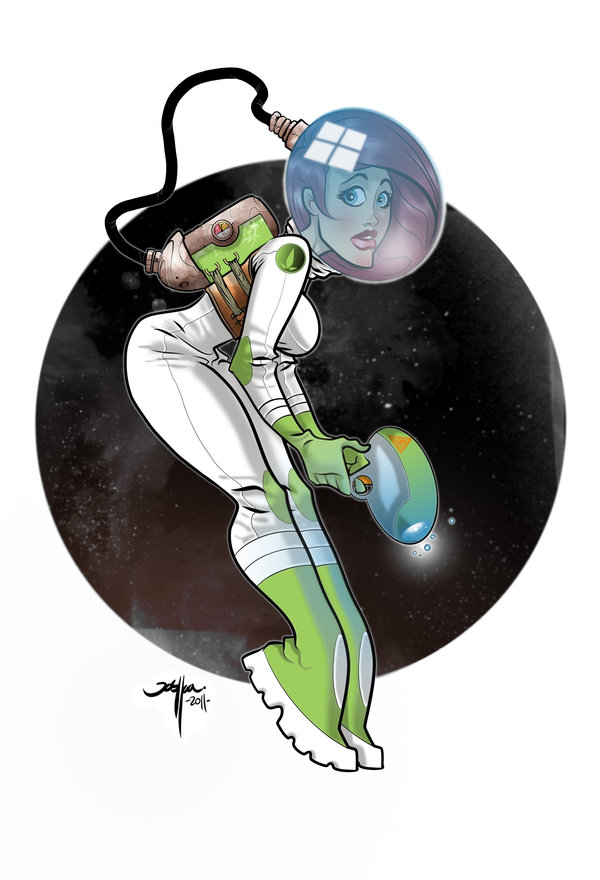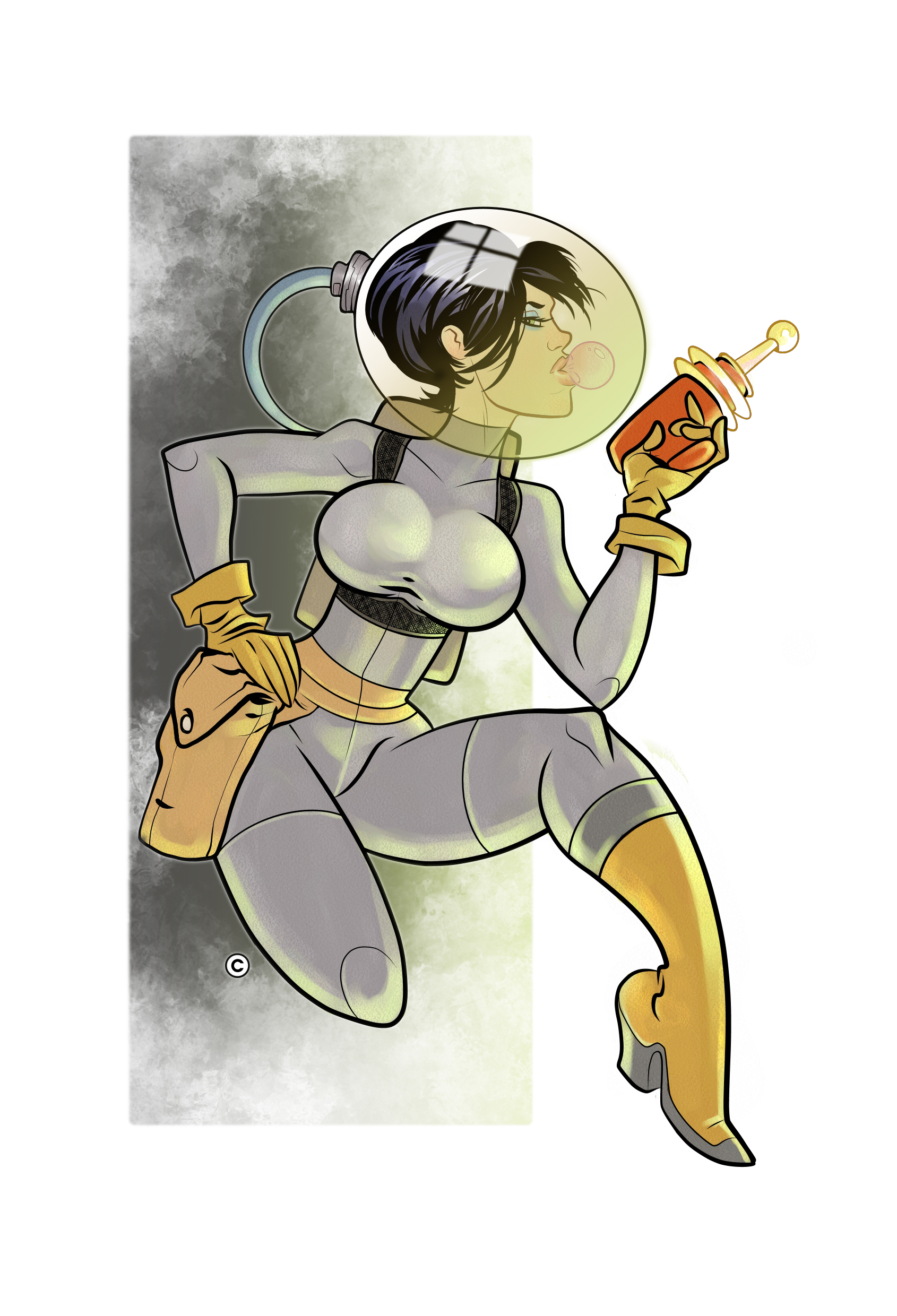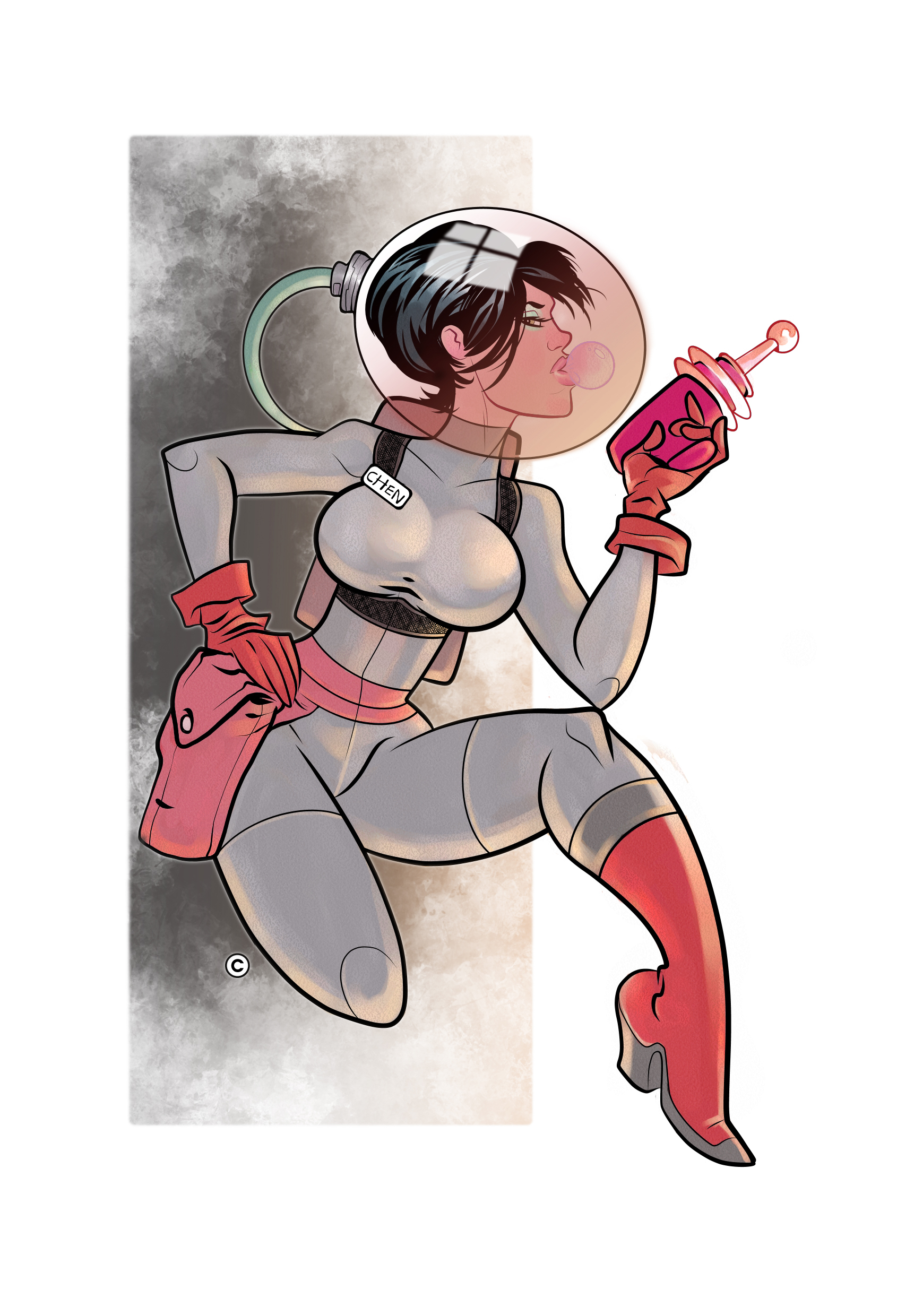 This character was original supposed to be this same COL. CHEN character that I posted yesterday. When I first came up with the idea for the character, I did something different and commissioned two different artist at once, Keith Howell and JOSHUA COVEY, and asked them both to draw me an Asian woman in a futuristic space suit with a ray guy, and name tag that said “CHEN.” But when Joshua sent me his image, posted above, I was a bit taken aback. Frankly, I didn’t expect her to be so…voluptuous.