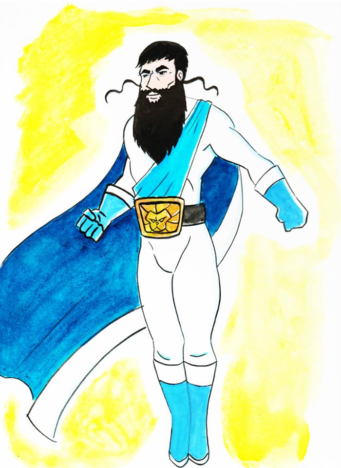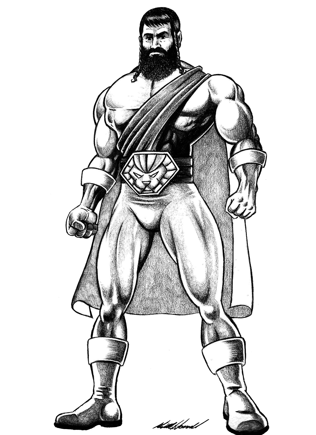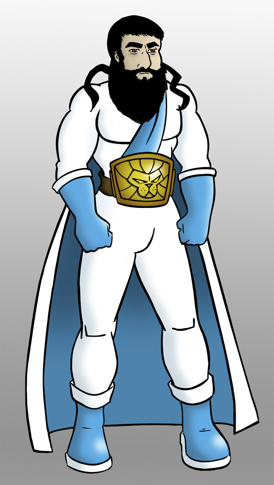 I knew I wanted him to be really big and muscular, as befitting his name. The costume was meant to be a pretty standard “Superman-ish” design, full-body with boots and cape, I also gave him gloves, but no mask. I made the colors blue and white like the flag of Israel. But then the hard part was coming up with some kind of symbol. I didn’t want to go with a Star of David, as that would be too obvious, like Marvel’s Israeli superhero Sabra. And, of course, I didn’t want to put some kind of “S” on his chest. I don’t recall how, but I eventually decided to go with a lion’s head, as in the Lion of Judah, although I’m not using the exact emblem, as his symbol, and to put it on his belt instead of his chest. I thought that gave a nice look of “power’ to his costume.